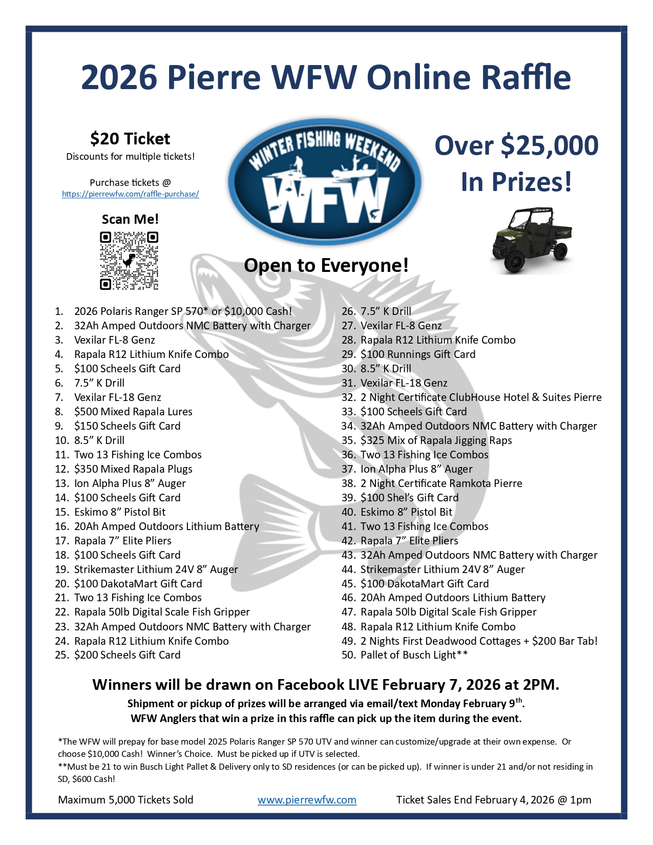 Maximum of 5,000 tickets sold until February 4, 2026 1pm. Drawing held February 7, 2026 at 2pm Live on Facebook.